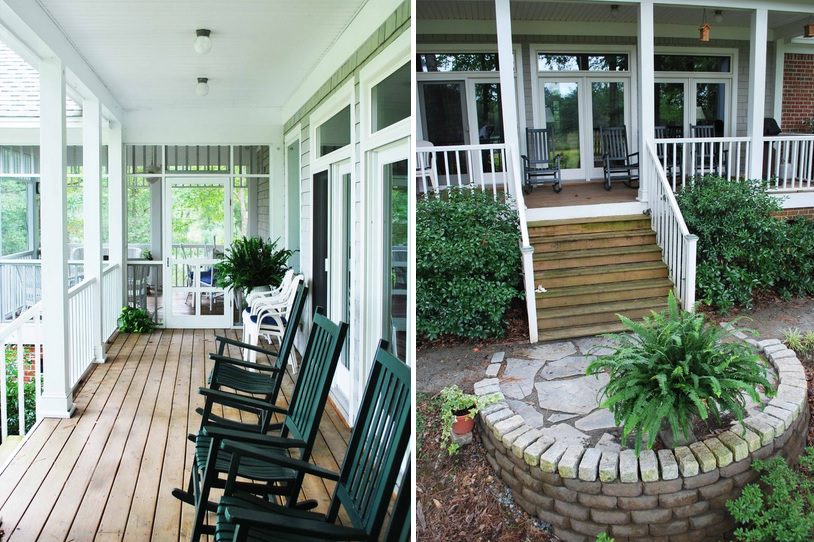 Esto es más o menos lo contrario de un porche de entrada frontal. Está ubicado en la entrada trasera y se conecta en la puerta trasera. A menudo está abierto y tiene un techo y puede ser un porche bastante grande, dependiendo de la casa. Un porche trasero ofrece mucha privacidad.