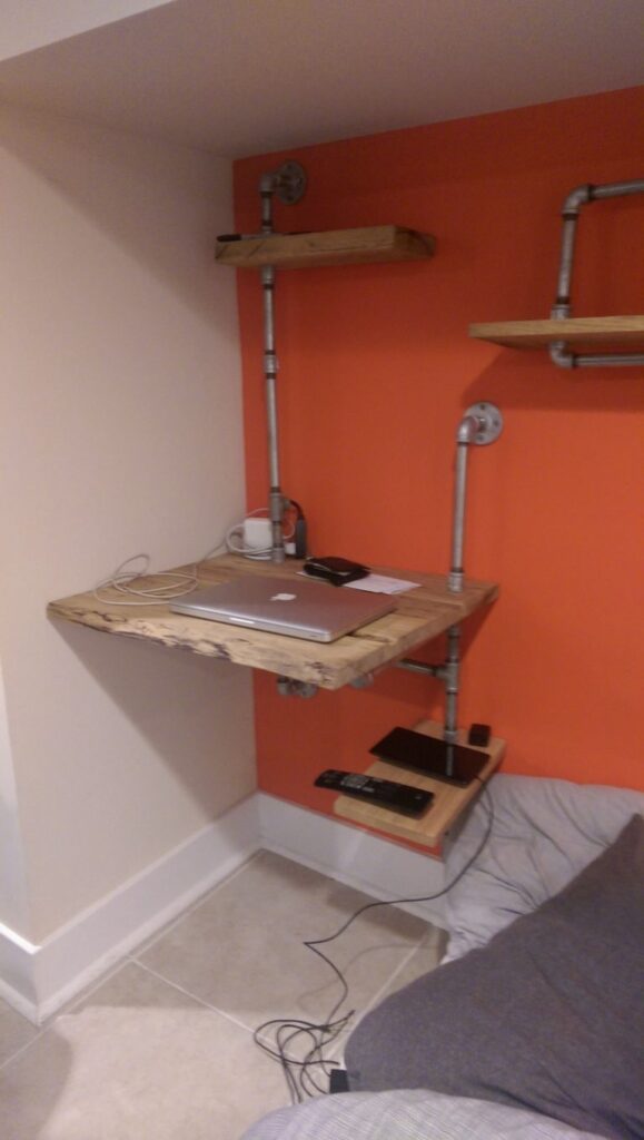 Este conjunto de muebles utiliza tubos de metal para crear estantes por toda la pared. Este proyecto es altamente personalizable, ya que puede usar tantos o tan pocos estantes como desee, haciéndolos del tamaño que pueda encontrar.