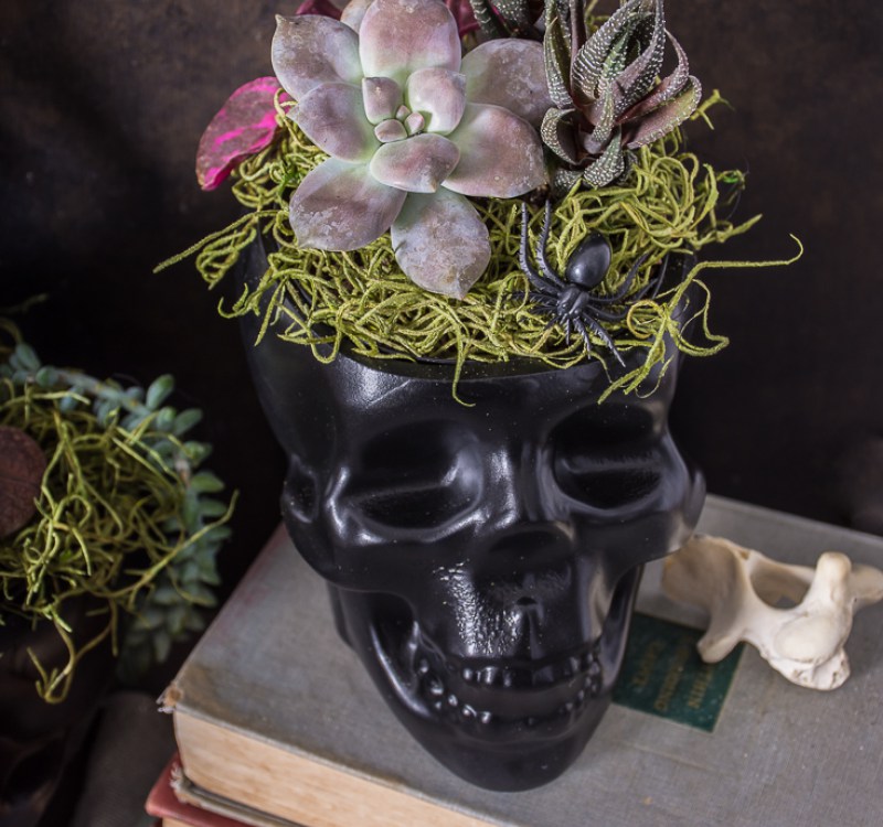Pintar una calavera de negro realmente puede cambiar el ambiente, haciendo que todo se vea dramático y espeluznante. Puede suavizar el aspecto con algunos adornos lindos, como algunas suculentas diminutas o tal vez algunas flores. Si cortas la sección superior del cráneo, puedes convertirlo en una maceta de Halloween. La idea viene de diyinpdx y ahí es donde también encontrarás un tutorial detallado para esta manualidad.
