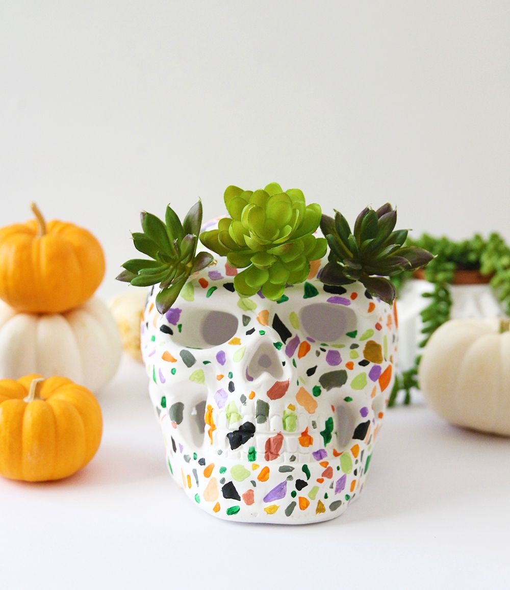 Este colorido cráneo de terrazo también se ve muy lindo y feliz, especialmente con esas pequeñas suculentas en él. Si desea hacer algo similar, esto es lo que necesitará: una calavera de yeso simple, pintura acrílica en algunos colores diferentes, un pincel, pequeñas suculentas de imitación y una pistola de pegamento caliente. Puedes encontrar todos los detalles del proyecto en blissmakes .