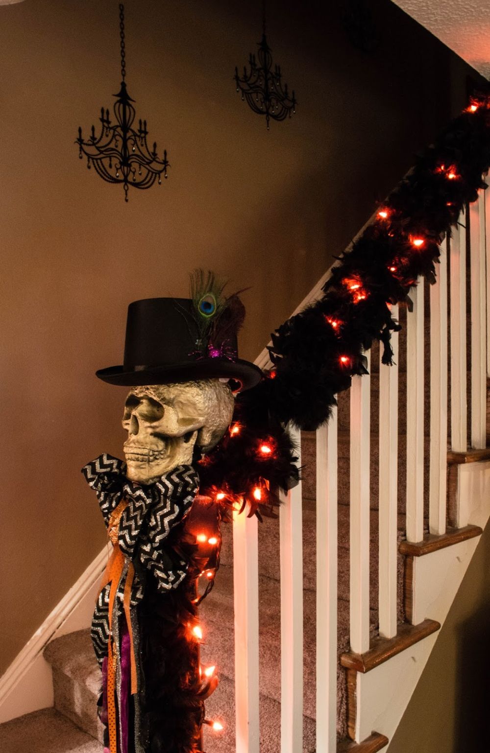 Mira qué elegante y fabulosa es esta calavera… parece que está vestida y lista para la fiesta. Se ve muy bien al final de las escaleras y con ese sombrero y bufanda geniales. También nos gusta la guirnalda de plumas negras que se utiliza para decorar el pasamanos. Encuentre detalles sobre este proyecto en entertainmentgrace .