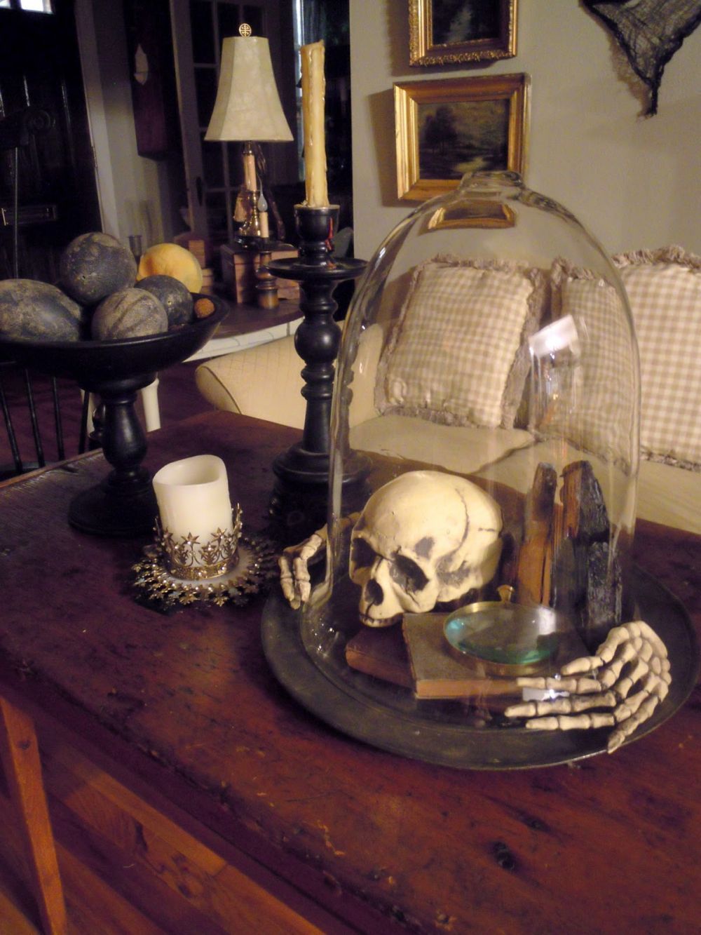 El cráneo es definitivamente una parte importante de esta pieza central de Halloween, pero hay más que eso involucrado en la configuración. Puede reunir algunos objetos espeluznantes con temas de Halloween y exhibirlos todos debajo de una campana. Este puede ser tu nuevo centro de mesa de Halloween. Esta idea espeluznante proviene de atinycottageongrand .