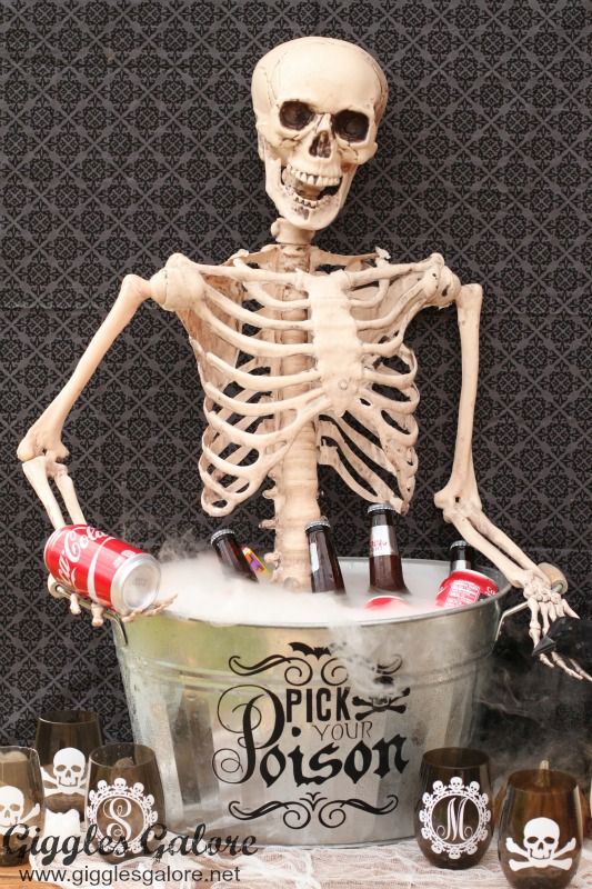 En caso de que desee mostrar el esqueleto completo y no solo el cráneo, tenemos una idea que podría interesarle: un cubo de bebidas con esqueleto de bricolaje. Es exactamente lo que crees que es: un cubo de hielo con un esqueleto dentro. Bueno, en realidad es un poco más elegante de lo que parece, así que asegúrate de visitar gigglesgalore para conocer todos los detalles del proyecto.