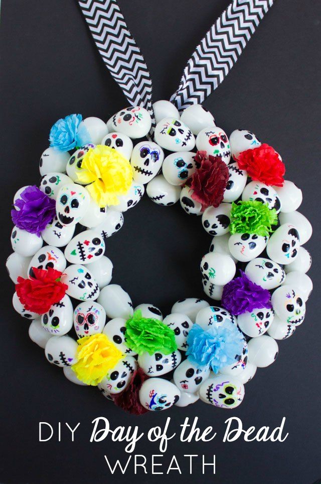 En realidad, no necesitas calaveras para hacer decoraciones de Halloween con calaveras. Puedes improvisar y usar huevos de plástico simples que puedes pintar con rotuladores para convertirlos en pequeñas calaveras que luego puedes pegar en forma de corona para crear una corona festiva de Halloween. La idea surge del diseño improvisado . Si no eres un gran fanático de las coronas, puedes usar las pequeñas calaveras de huevo para hacer una guirnalda colgante.