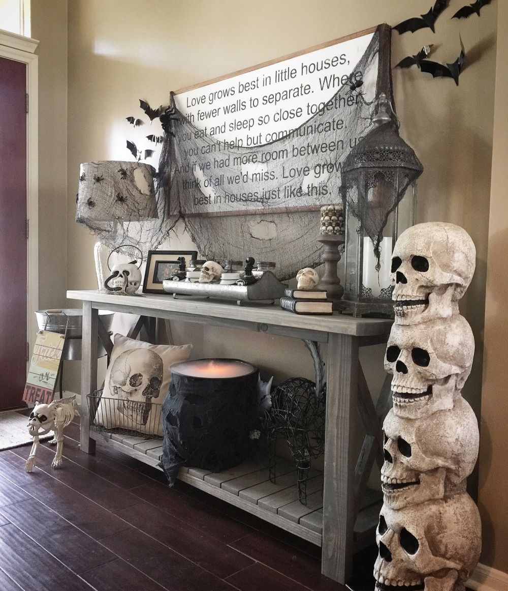 Dos calaveras son mejor que una y tres son mejor que dos, así que, siguiendo esta lógica, será mejor que empieces a juntar tantas calaveras como puedas para que puedas hacer de este Halloween el más espeluznante hasta el momento. Una buena idea podría ser apilar un montón de calaveras y hacer una especie de tótem espeluznante que puedas exhibir junto a la chimenea, junto al sofá o en la puerta de entrada. Echa un vistazo a homedecormomma para descubrir cómo lograrlo.