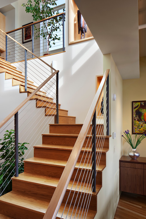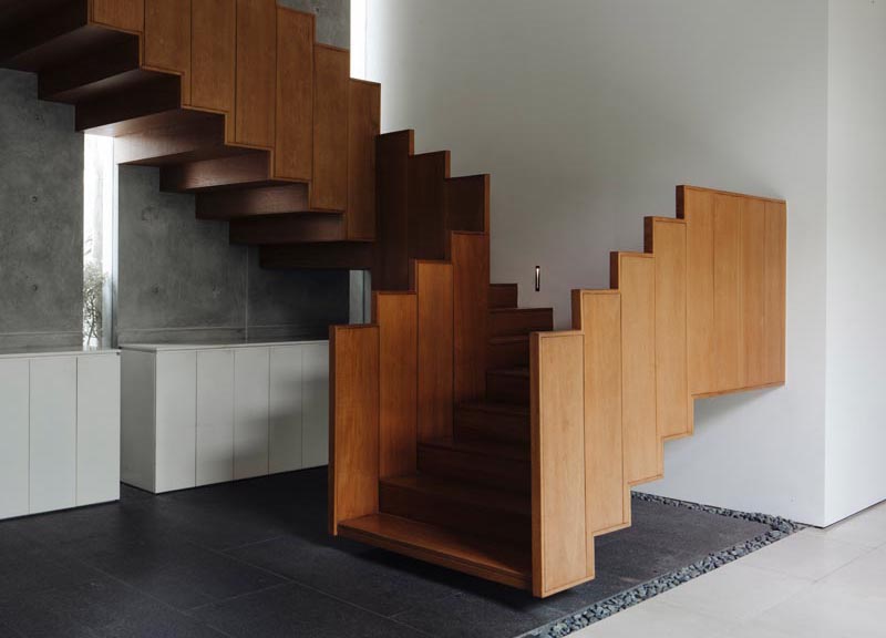Diseñado por  Square Feet Architects, esta casa contemporánea incluye una escalera de madera que es más fácil de usar que otros diseños. Un solo pasamanos corre a lo largo de la escalera mientras que las balaustradas se alinean al otro lado.