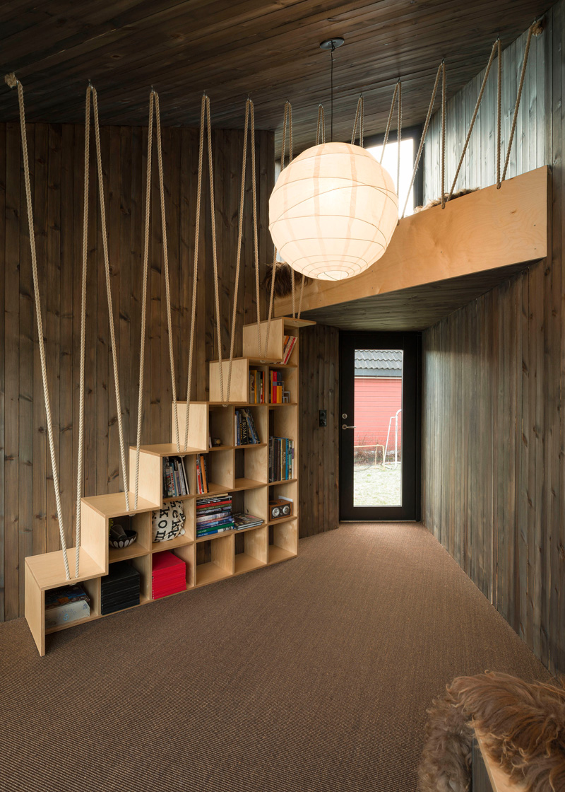 Incluir un espacio de almacenamiento en el diseño de la escalera es inteligente para un espacio pequeño. La cabaña del escritor, diseñada por Jarmund/Vigsnæs Arkitekter , es un ejemplo. La escalera es una serie de cubículos y la baranda está hecha de cuerda que corre a través de las escaleras y lazos de metal unidos al techo. Es simple pero interesante.