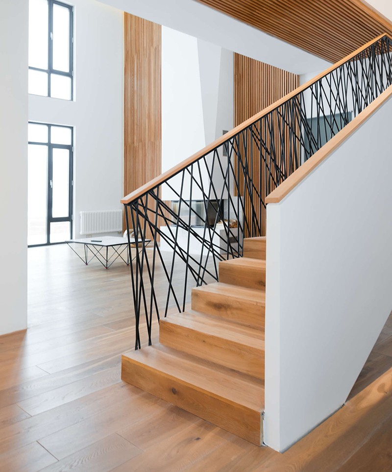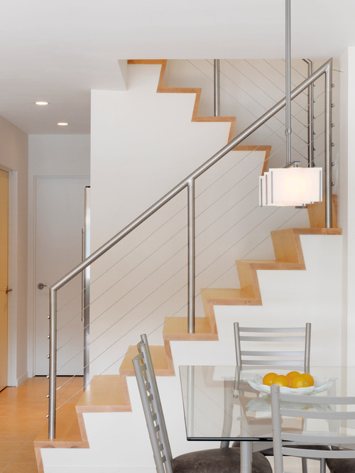 Otros materiales pueden crear diseños únicos y geniales. Tome esta escalera moderna de Monoloko Design , por ejemplo. Además de una base súper limpia y plana, también tiene un diseño de barandilla con soportes de acero en ángulos aleatorios.
