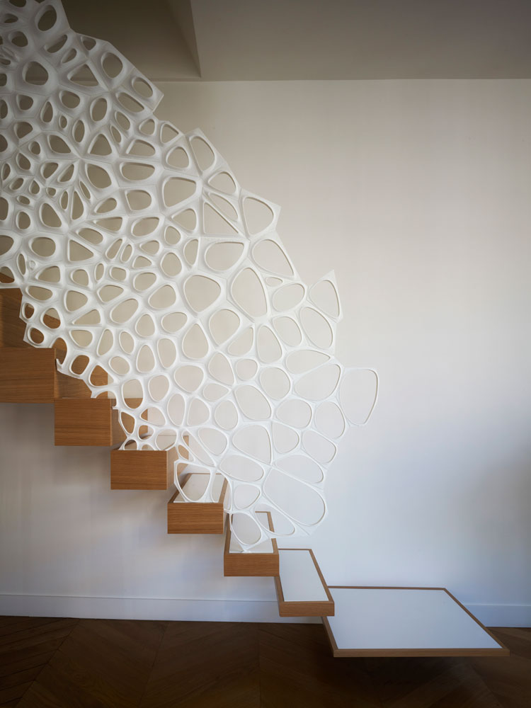 Una de las barandillas de escalera más interesantes y llamativas de nuestra lista es de Marc Fornes / Theverymany , junto con el arquitecto Ammar Eloueini y está hecha de Corian. Tiene un diseño abstracto, como una telaraña o panal. Su estructura de aspecto orgánico, que cambia de forma y parece estirarse más hacia la parte inferior de las escaleras.