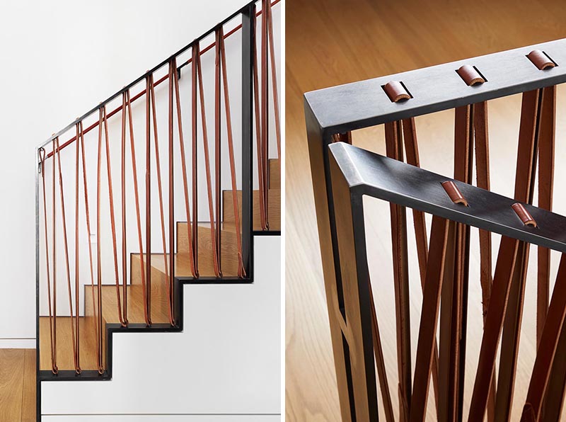 Esta barandilla de escalera de aspecto atractivo utiliza cuero. No esperaría ver el material en un riel de escalera, pero se ve muy bien. El acero y el cuero ofrecen un diseño simple y moderno. De los estudios CLB Architect y Brandner Design .