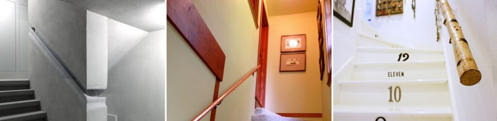 Los pasamanos incorporados ofrecen menos mantenimiento ya que se colocan dentro del hueco de la escalera. Una característica clave es cómo los pasamanos brindan más espacio en el ancho de la escalera. El diseño no tiene un pasamanos sobresaliente que se extienda a lo largo de la escalera. Esta característica proporciona un pasaje abierto, lo que facilita el subir y bajar objetos grandes por las escaleras.