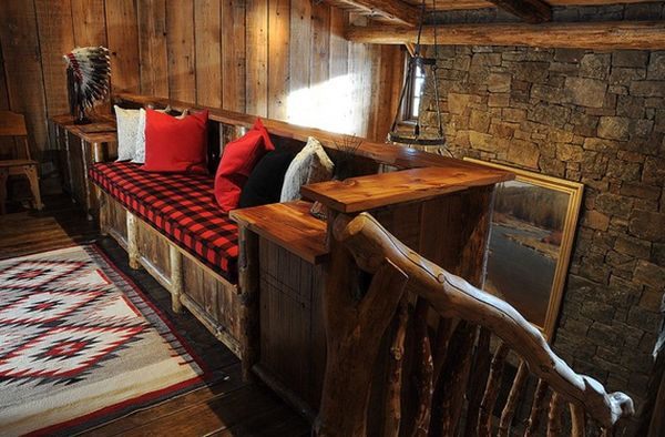 Esta casa rústica tiene una fantástica escalera. Cuenta con una barandilla de rama de árbol, perfecta para esta cabaña de invierno. Le da a la habitación una sensación acogedora mientras se suma a su decoración original.