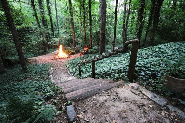 Otra escalera de jardín con una enredadera como pasamanos. La forma de espiral es uniforme y se funde con este paisaje boscoso.