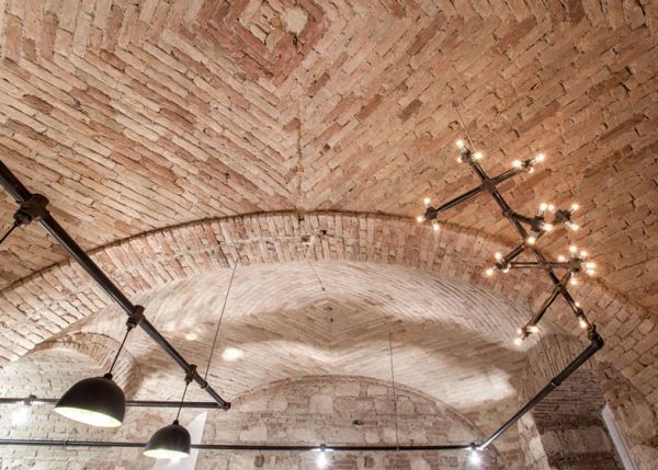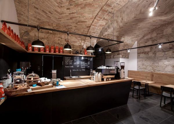 Este café se encuentra en Budapest y fue un proyecto del estudio húngaro Spora Architects . El café está incorporado en un antiguo palacio de 200 años, de ahí los detalles arquitectónicos como los techos abovedados y la combinación de ladrillo y piedra. Los arquitectos descubrieron los techos abovedados de ladrillo originales y expusieron las paredes originales de ladrillo y piedra, dando a este lugar un aspecto auténtico.