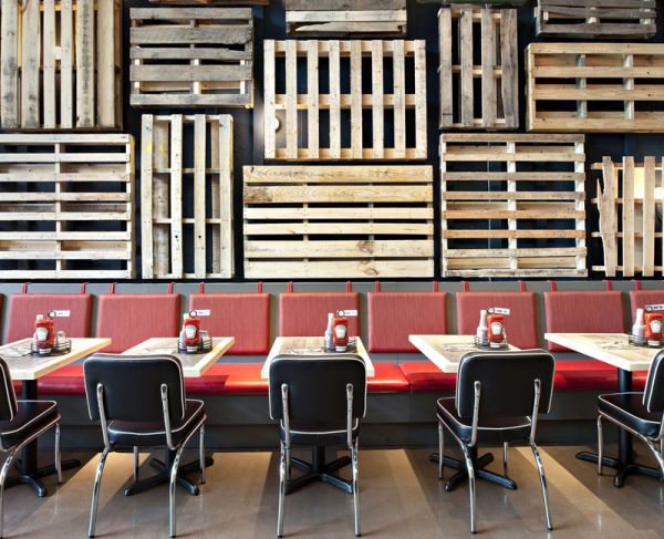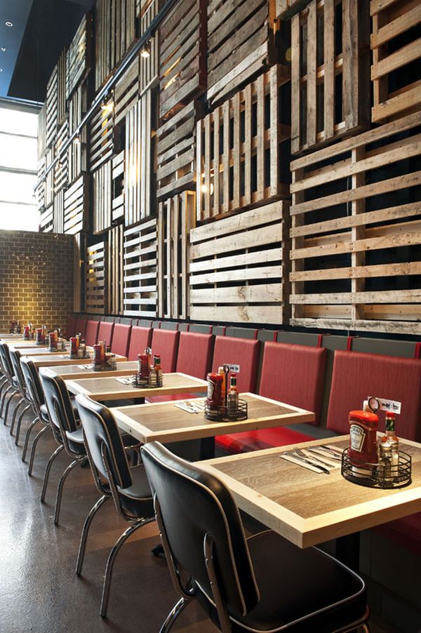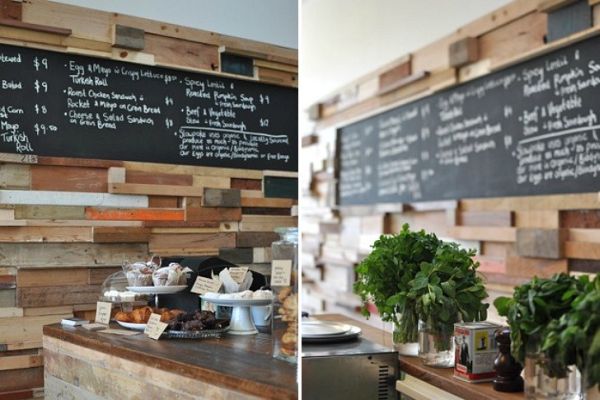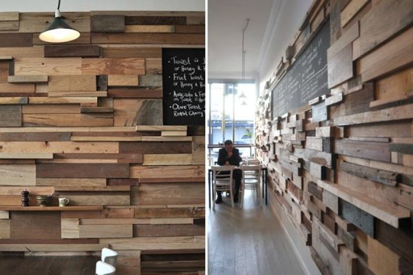 En el caso del Slowpoke Cafe de Melbourne, se utilizó madera reciclada para revestir las paredes. Fue un proyecto del diseñador francés Sasufi . Además, los tableros de las mesas están hechos de tarimas recicladas. La característica más impresionante son las paredes de 12 metros de largo creadas con recortes de madera recolectados de los fabricantes de muebles locales y reciclados.