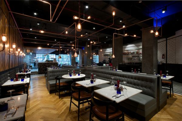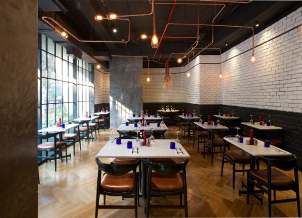 El restaurante PizzaExpress se encuentra en Mumbai, India, y es un espacio relajado diseñado con ladrillos a la vista recuperados, hormigón pulido y techos abiertos. Los accesorios de iluminación de tuberías son una característica muy interesante. Otro detalle llamativo viene en forma de azulejos de metro en las paredes.