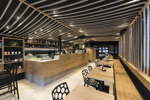 Cafetería Origo – Vigas Pintadas y Pizarra.