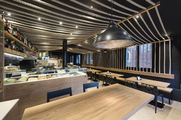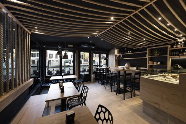 La arquitecta Silvia Simionato es la responsable de este elegante interior del restaurante. El restaurante y cafetería Al Parlamento está situado en Venecia, Italia, y presenta un interior definido por la sencillez y la hermosa iluminación. Las paredes negras y la cuerda le dan a este lugar una sensación única. Aunque simple, el diseño también es sofisticado.
