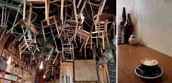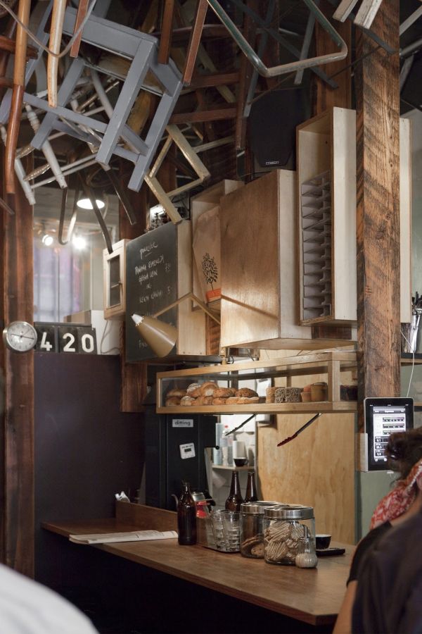 Brother Baba Budan es un pequeño café en Melbourne, Australia. Tiene un diseño interior muy inusual e intrigante, cuenta con sillas en el techo. Esta característica poco común se utilizó para llamar la atención y enfatizar la altura del espacio. De esta manera, te concentras en esta función y no te das cuenta de lo pequeño que es este lugar. {imágenes de Erika Hildegard }.