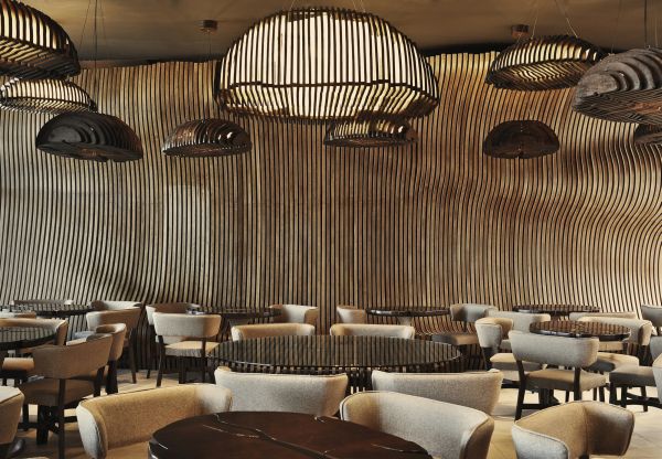 Don Cafe House en Pristina, Kosovo, es un espacio muy hermoso. Diseñado por Innarch , el interior presenta un concepto visual único. La madera encorvada de las paredes da la impresión de estar dentro de un enorme saco de café. También son muy interesantes las luminarias, que recuerdan a los granos de café.