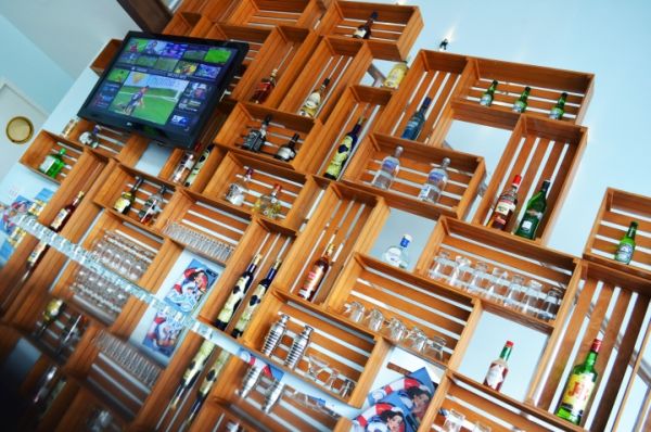 El restaurante Muelle Kay se encuentra en Mérida, en el sureste de México, y fue construido con materiales comúnmente vistos en los puertos locales, como cajas, tablones de madera, cuerdas y telas para velas. El resultado fue un diseño moderno y casual. El mostrador de la barra se diseñó utilizando cajas apiladas que soportan el mostrador de granito negro. También se usaron cajas para dividir el espacio en la barra de la barra. {Encontrado en el sitio }.