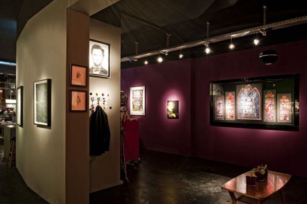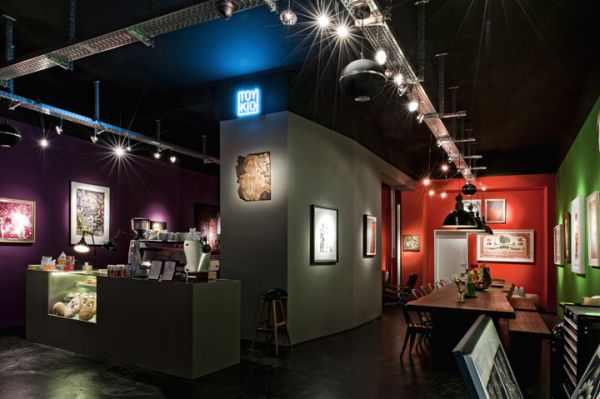 En Dusseldorf hay un lugar llamado Toykio Coffee & Gallery. Es un café encantador con azulejos de metro negros que recubren la barra y las paredes y colores llamativos en todas partes. La decoración interior enfatiza fuertes contrastes. Las paredes decorativas en negrita complementan el techo negro y el accesorio de iluminación de estilo industrial le da al espacio un aspecto ecléctico. {Encontrado en el sitio }.