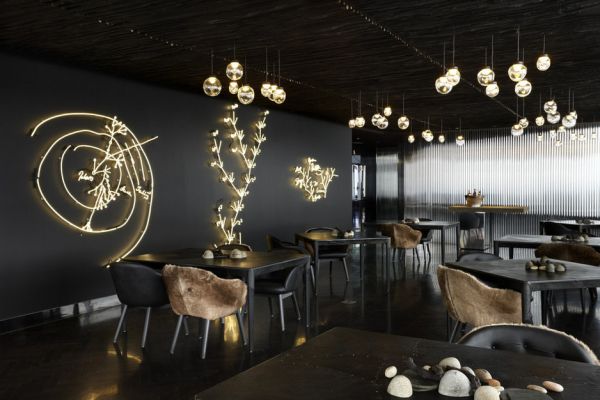 Ubicado en el centro de negocios de Melbourne, el café Vue de Monde impresiona a los visitantes con el arte LED que se muestra en las paredes. Los tonos de carbón utilizados en todas partes se complementan con muebles llamativos y accesorios de iluminación. La obra de arte de neón fue un proyecto del artista Joseph Kosuth.
