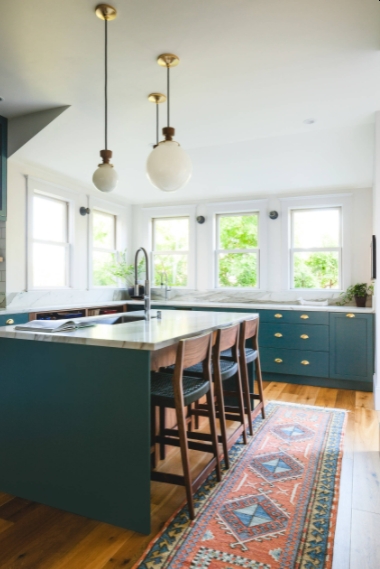 Nos encanta cómo Knocknock combinó estos muebles de cocina de color verde azulado con un diseño de techo y pared completamente blancos, lo que resultó en una configuración luminosa en la que siempre vendrá a cocinar con placer. Las encimeras de mármol presentan tonos de blanco y gris, que también realzan la belleza y la viveza del verde azulado. Además, los gabinetes están equipados con herrajes dorados, lo que lo convierte en otra combinación de colores en el punto.