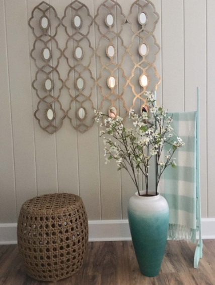 Queríamos mostrarte lo hermoso que puede ser un jarrón verde azulado, especialmente como parte de la decoración costera. Puede ver cómo se combina con un pequeño taburete de ratán que también se puede usar como otomana, mesa de café o incluso mesa auxiliar. Además, la transición del blanco al verde azulado es sencillamente deslumbrante y delicada, perfecta para la decoración mediterránea.