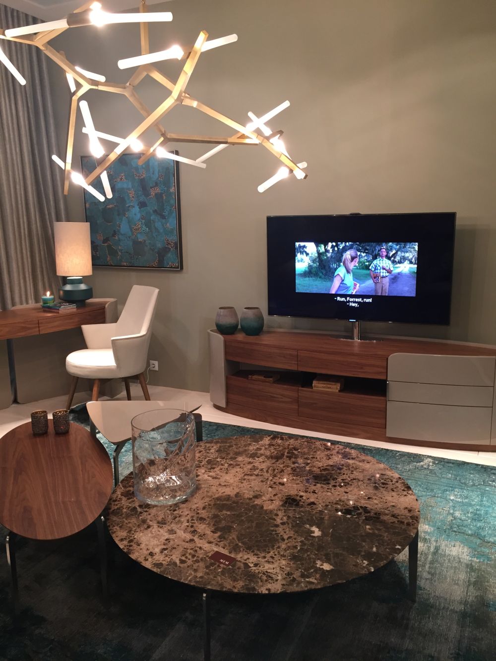 Taupe, tan hermoso y sereno como es, tiende a sentirse un poco aburrido cuando se deja que se las arregle solo en el diseño. Con su hermosa estética azul verdosa, el color verde azulado aporta ese elemento de agua y vida que capta de inmediato la energía y el atractivo fresco de un espacio neutral de color topo. Por supuesto, siluetas interesantes como este colgante abstracto de rama dorada siempre elevarán el nivel de interés visual en cualquier espacio, independientemente de la combinación de colores.