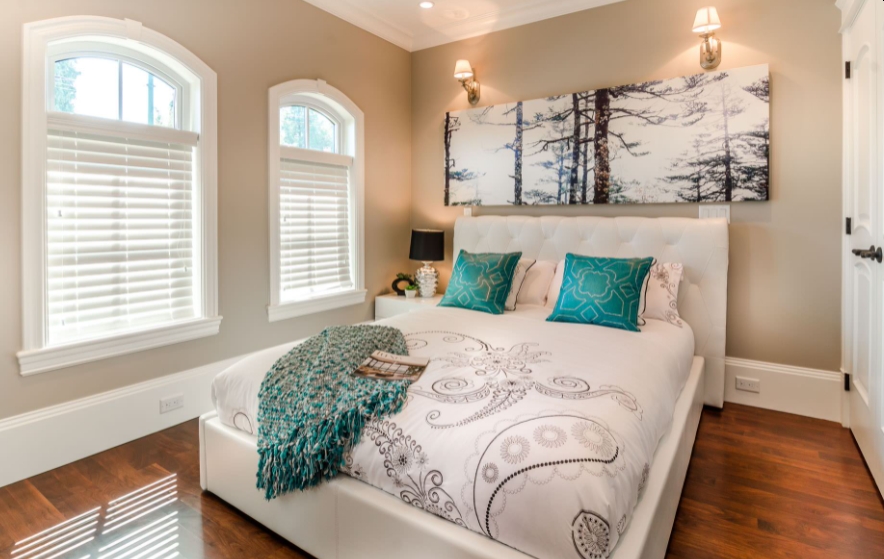 Si hay algo que notas después de ver MUCHAS ideas diferentes de decoración verde azulado es que las habitaciones claras y los acentos verde azulado son una combinación perfecta. Por ejemplo, este dormitorio en particular está decorado principalmente en blanco y beige, con pisos de madera de tono medio. Sin embargo, esos dos cojines de cama pequeños traen ese poderoso verde azulado que tiene sentido y agrega una gota de color a la habitación.