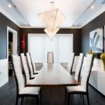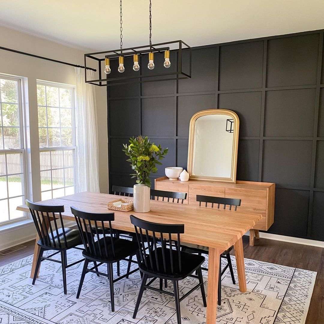 Una pared negra puede destacar demasiado por sí sola y, para evitarlo, suele ser una buena idea añadir algunos elementos diferentes a la habitación del mismo color. Este comedor tiene sillas negras colocadas alrededor de la mesa mientras la luz natural irradia el tono negro de la pared.