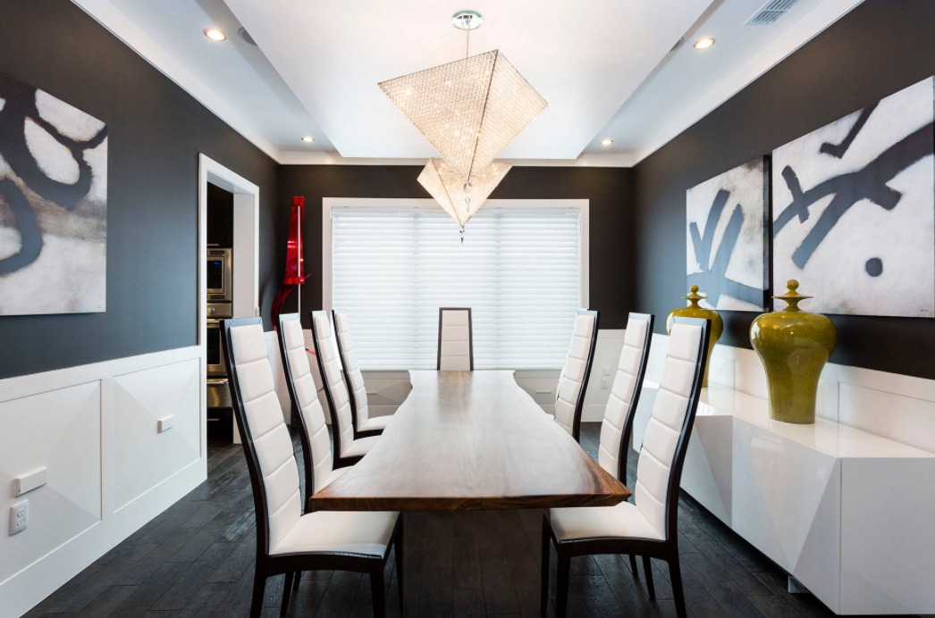 Para evitar que eso suceda, este elegante comedor tiene un borde blanco a lo largo de la parte superior que baja el techo y un revestimiento de madera blanco para la sección inferior con muebles blancos contra él. Eso ilumina el espacio y rompe la conexión con el suelo de madera teñido de oscuro.