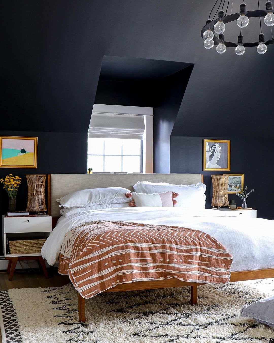 Si la habitación está en un ático o en un entrepiso y tiene un techo bajo o inclinado, pintar una de las paredes y el techo de negro puede lograr un efecto elegante y con estilo. Puedes ver eso en este hermoso diseño publicado por @designbydama .