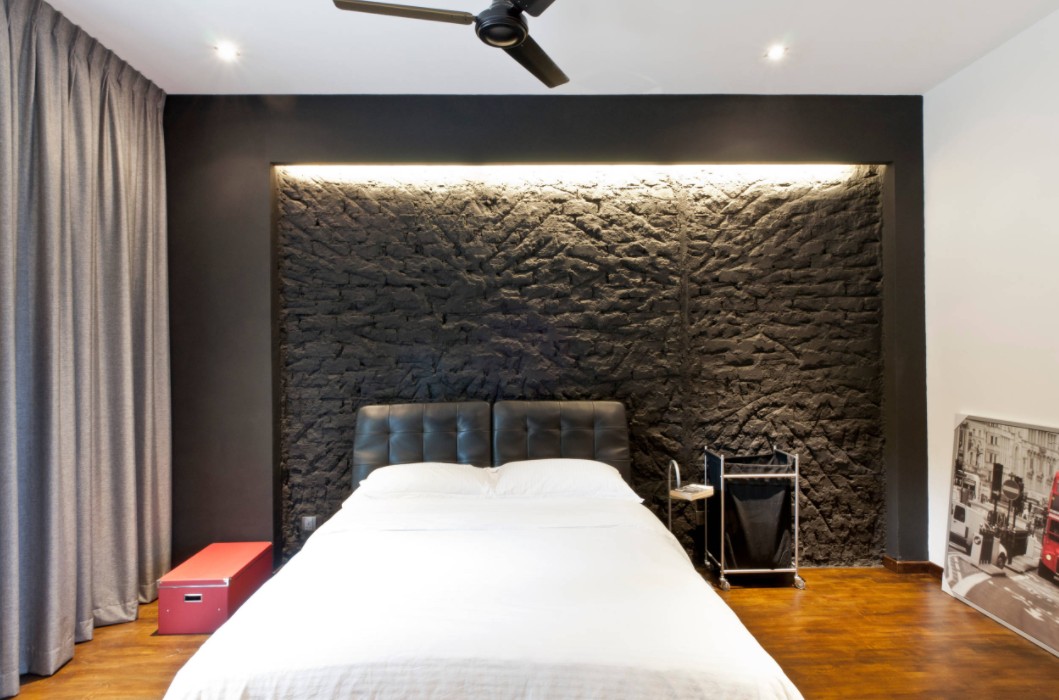 Las paredes texturizadas como esta se ven aún mejor cuando se usa iluminación de acento como punto culminante. Este dormitorio negro tiene una hermosa textura de piedra con un marco limpio a su alrededor y la banda de LED en la parte superior enfatiza esta sección en particular y también tiene un propósito práctico. Este diseño interior del estudio Architology muestra cómo los detalles sutiles pueden cambiar por completo un espacio.