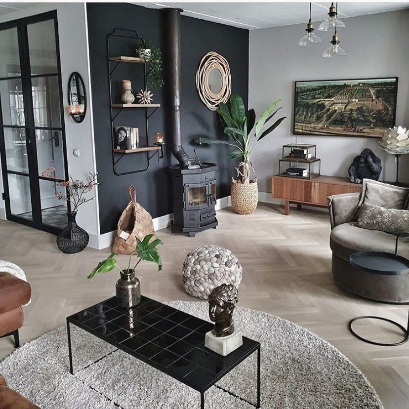 No cubra demasiado la pared ni coloque muebles negros a juego y otras cosas contra ella. Algunas decoraciones están en orden pero mantienen las cosas simples. Nos gusta mucho la chimenea y los tonos neutros cálidos que aparecen en este diseño de @simplyelevatedinteriors .