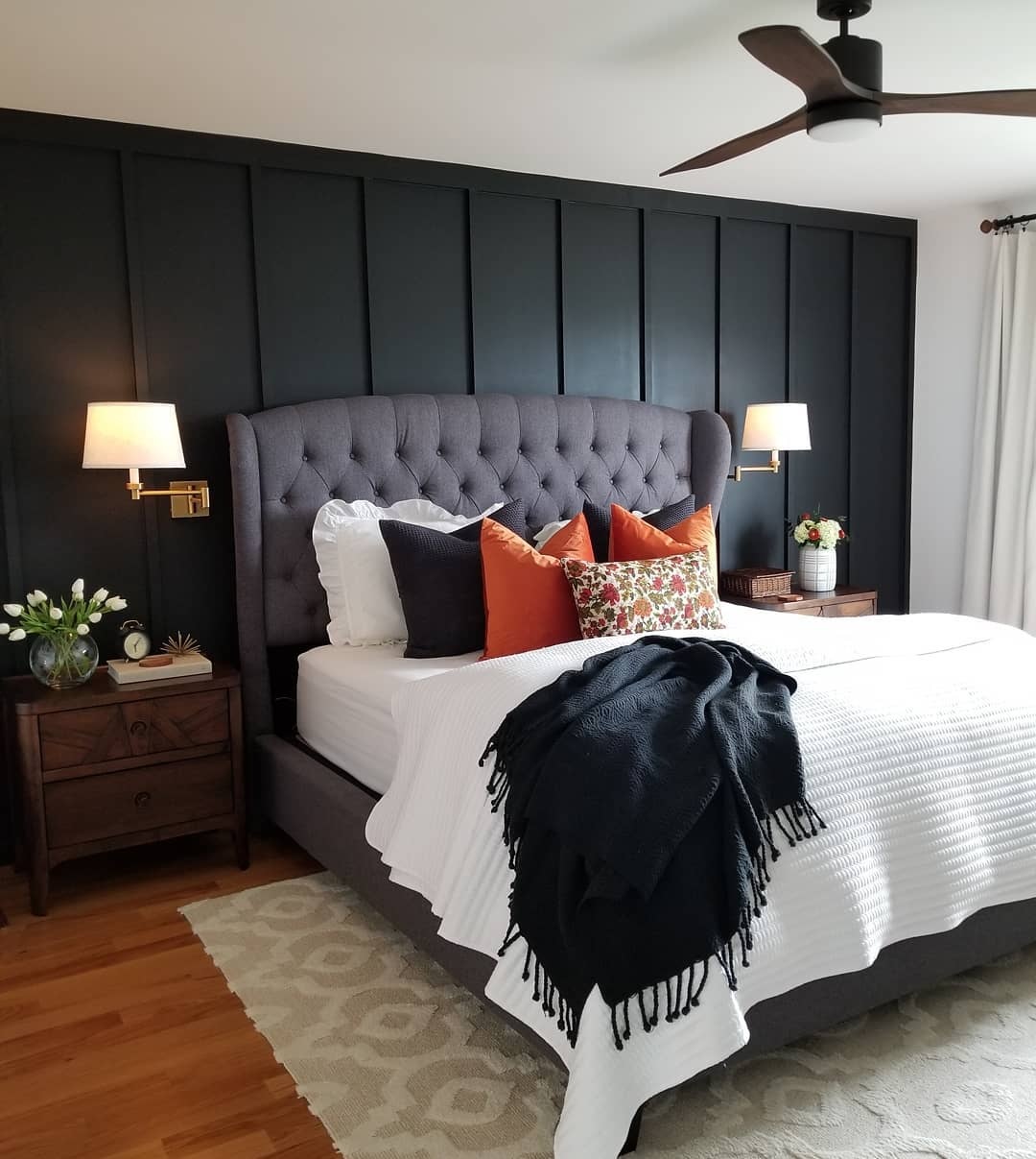 Las características de la pared negra del dormitorio complementada con una cabecera de madera y una mesita de noche a juego ofrecen un contraste industrial con un toque rústico. Los marcos de las ventanas de color marrón claro rompen la planitud de la pared oscura. Siga a @houseofhanes para obtener más inspiración.