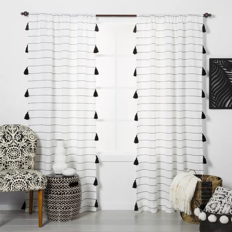 Estas cortinas en blanco y negro de Target funcionarán con muchos estilos de diseño. Tienen un aspecto reducido que agrega textura en lugar de un diseño o color dramático. Además del boho, también funcionarán con estilos de casa de campo o rústicos.