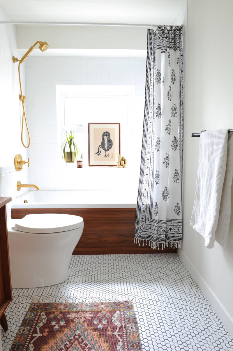 Esta cortina de baño de tela con flecos en la parte inferior agrega textura a este baño elevado de mediados de siglo. Además, la cortina de baño boho hace eco de los tonos simples del piso de baldosas hexagonales. Por lo tanto, esto permite que la alfombra vibrante y el marco de la bañera dominen. Este diseño de baño nos llega de Mango Design Co.