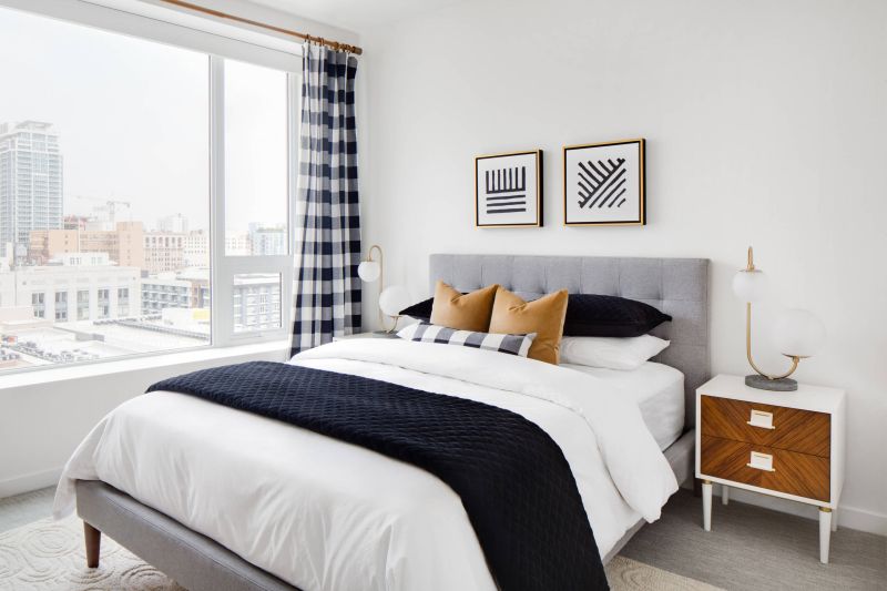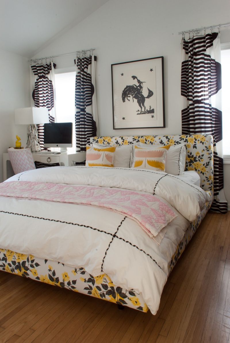 Ve a lo grande o vete a casa; ¡Ese es el lema de estas cortinas de cuadros de búfalo en blanco y negro! Nos encanta cómo este patrón rústico se combina con el dormitorio moderno de mediados de siglo de Lindye Galloway Interiors . Además, las cortinas con motivos en blanco y negro se suavizan con ropa de cama sencilla y arte en las paredes en blanco y negro.