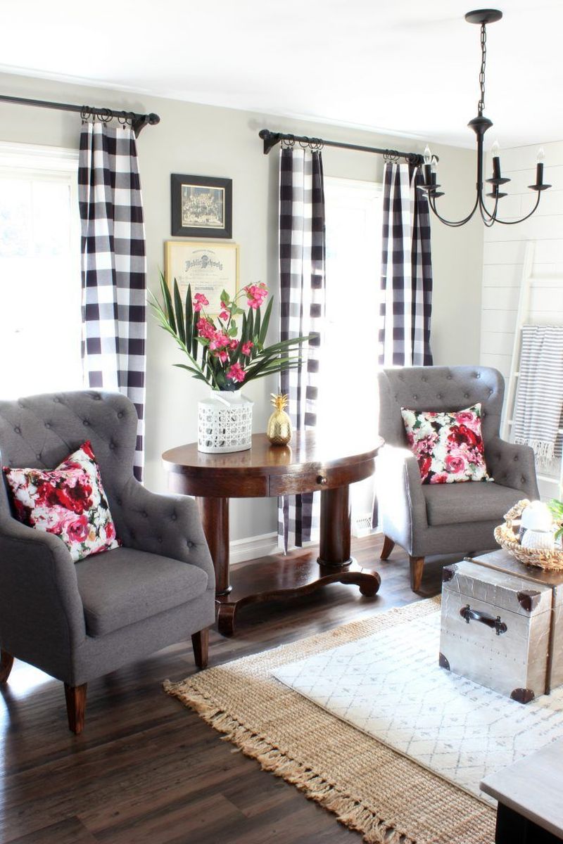 Nos encanta cómo esta sala de estar de Jamie Merida combina la tela escocesa en blanco y negro con estas cortinas florales contemporáneas. Además, el diseño floral moderno agrega sofisticación a la habitación sin que se sienta sofocante. Una vez más, las cortinas se cuelgan en alto para enfatizar los techos altos. Esto da como resultado una habitación con una sensación más abierta.