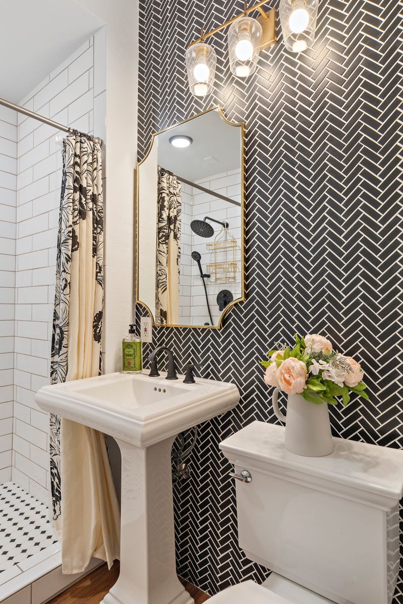 Este baño de Home Quality Remodeling es impresionante. La cortina floral junto con la pared de azulejos negros en espiga crea una apariencia dramática. Además, los accesorios dorados agregan la cantidad adecuada de brillo. Los resultados son hermosos.