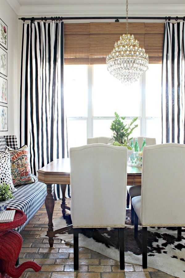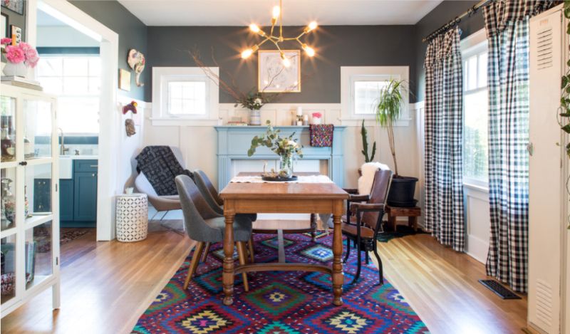 Mira este comedor ecléctico de Emilia Decor . La alfombra multicolor brillante toma protagonismo, y las cortinas en blanco y negro no intentan competir. Más bien, crean otra capa de textura que no domina la habitación.
