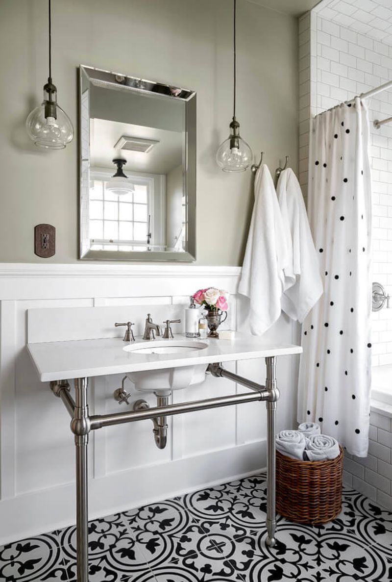Esta cortina de baño de Jodi Foster Design + Planning no se ve fuera de lugar en este hermoso baño. Más bien, agrega un poco de alivio lúdico y equilibra el intrincado patrón del piso.