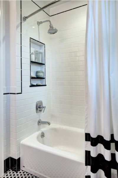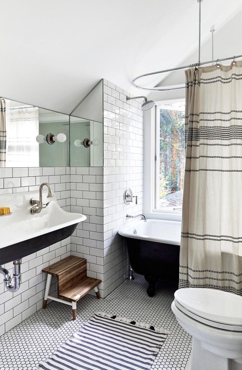 Esta cortina de baño moderna se presenta en un baño de Tracy Stevens Interior Design Inc. Este baño combina un estilo histórico y moderno. Por ejemplo, mezclan una pared clásica de azulejos de metro y un piso de mosaicos en blanco y negro con una cortina moderna de rayas anchas.