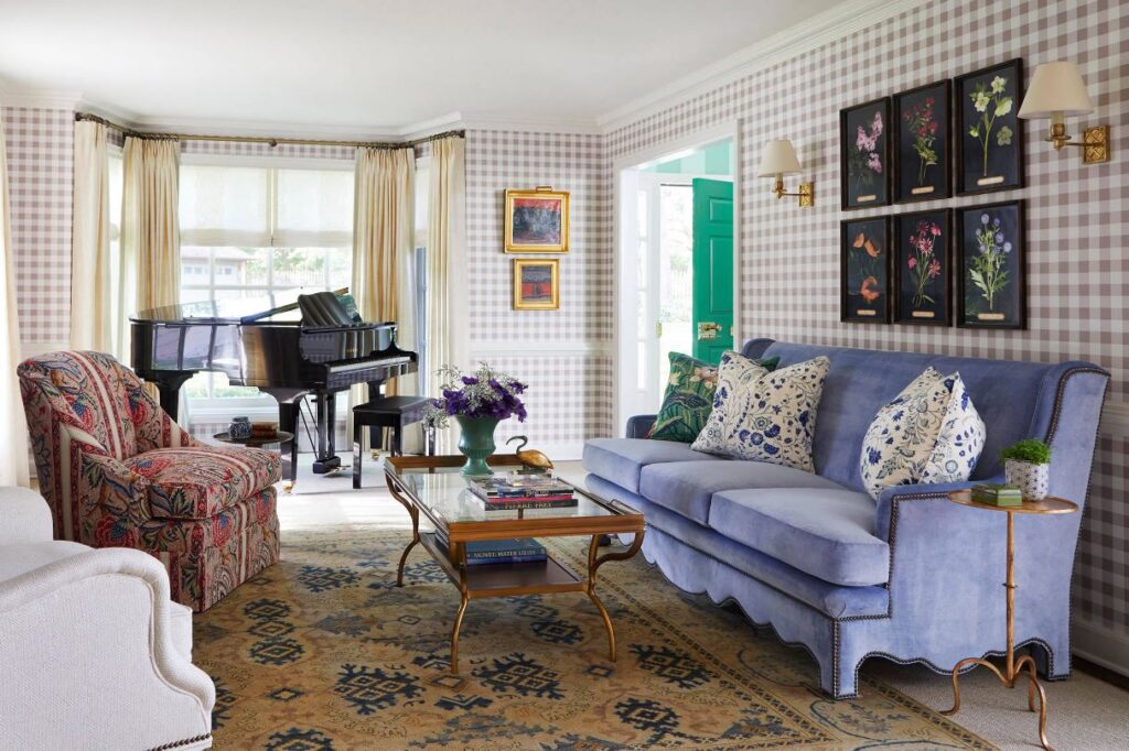 Cualquier tono amarillo puede hacer que un papel tapiz de color bígaro se vea mejor. Imagina una manta a cuadros o una canasta de frutas. Los tonos amarillos y azulados son buenos amigos en los espacios de diseño de interiores y este no es una excepción.