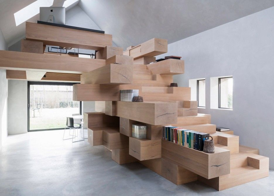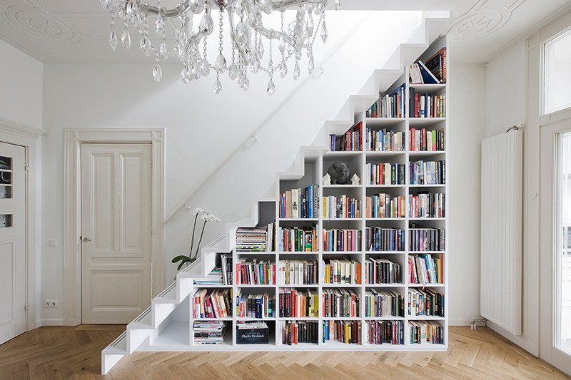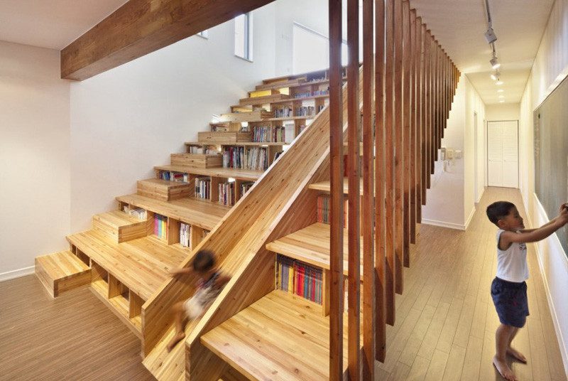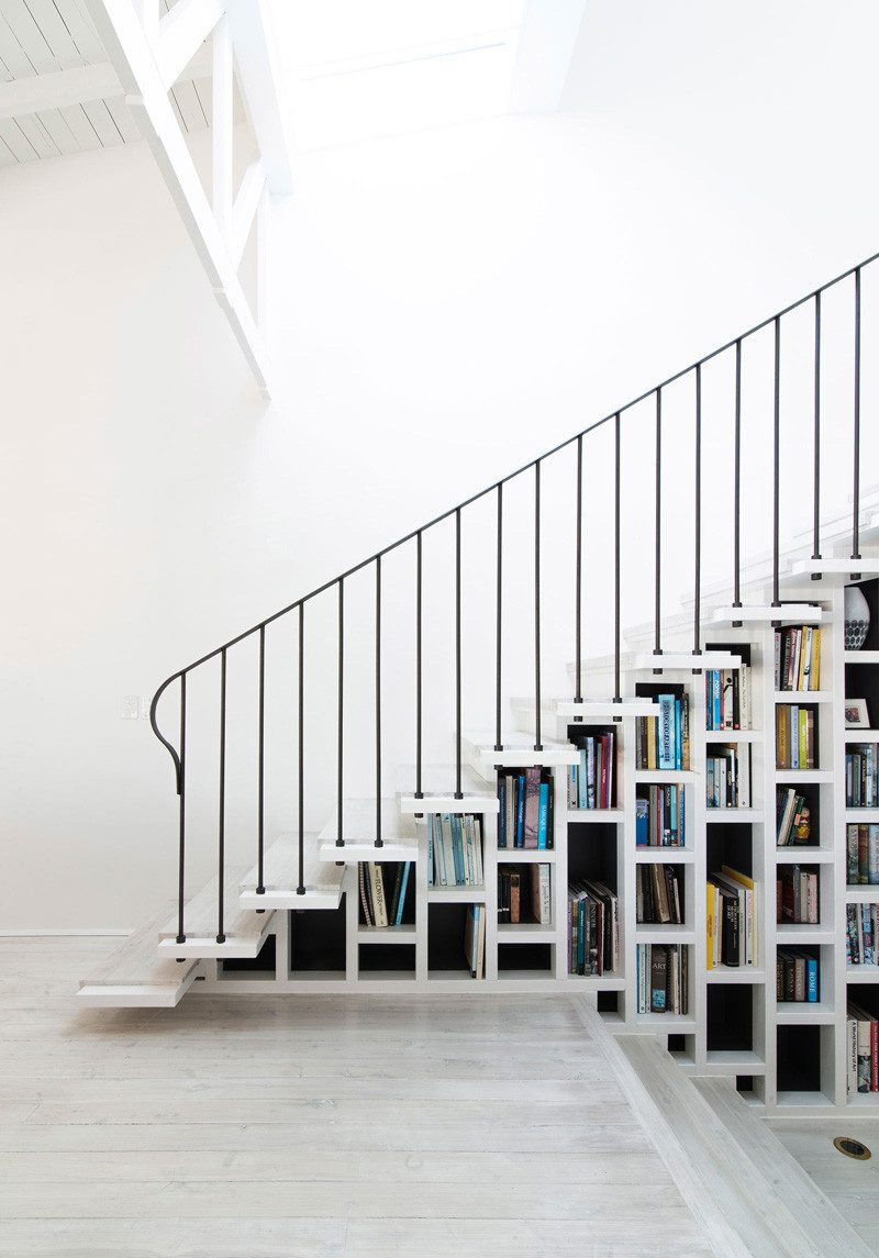 Si la necesidad de almacenamiento es mayor que la necesidad de una escalera tradicional, este diseño podría funcionar maravillosamente. Las escaleras son grandes y cada una ofrece mucho espacio debajo para varias filas de libros. Es un diseño de mlnp Architects que realmente nos inspira a pensar fuera de la caja.