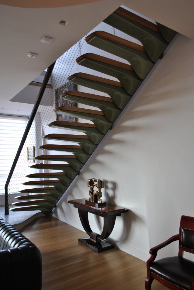 Hechas de resina compuesta y con una estructura de acero tubular, estas escaleras están en voladizo desde la pared y se ven realmente geniales y llamativas. Los peldaños están hechos de roble blanco.