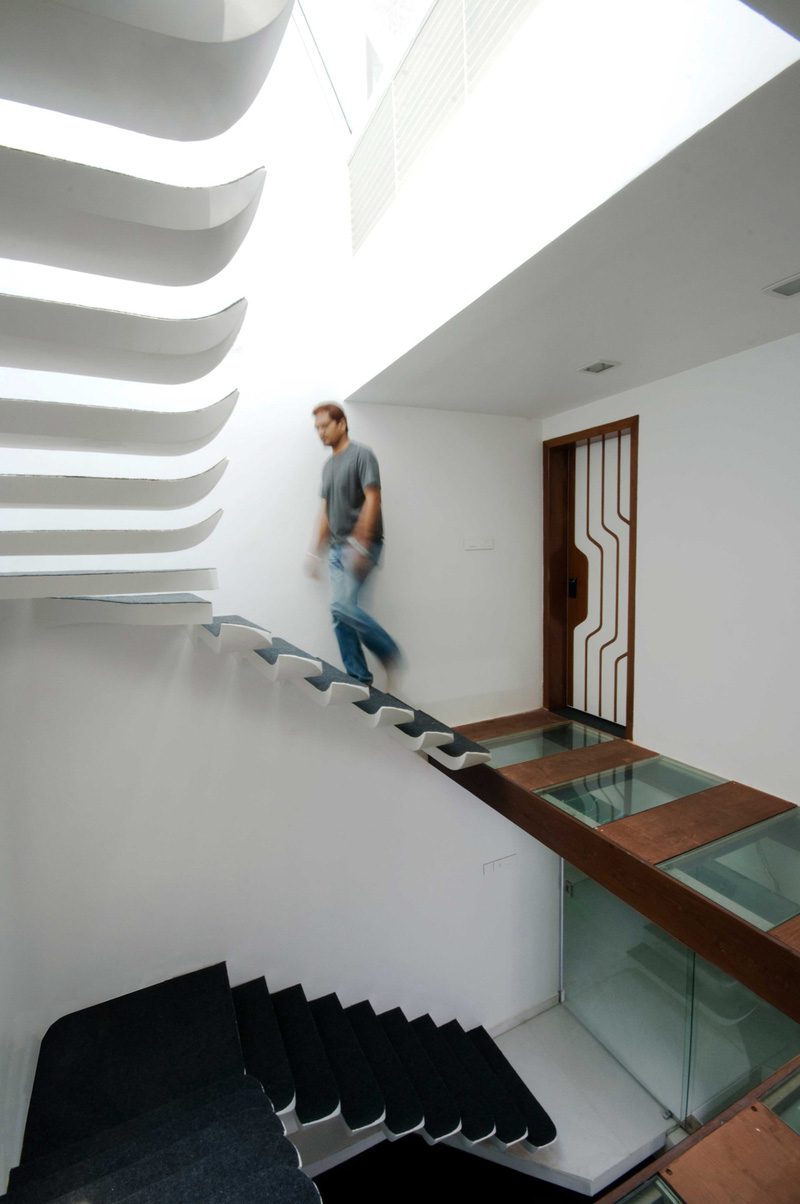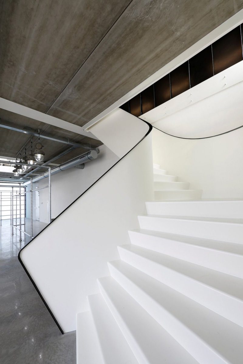 Técnicamente, estas escaleras no carecen de barandillas en su totalidad. Los dos niveles están unidos por un diseño continuo y fluido y los únicos peldaños independientes son los tres inferiores. {Encontrado en el Taller Arquitectura en Movimiento .}.