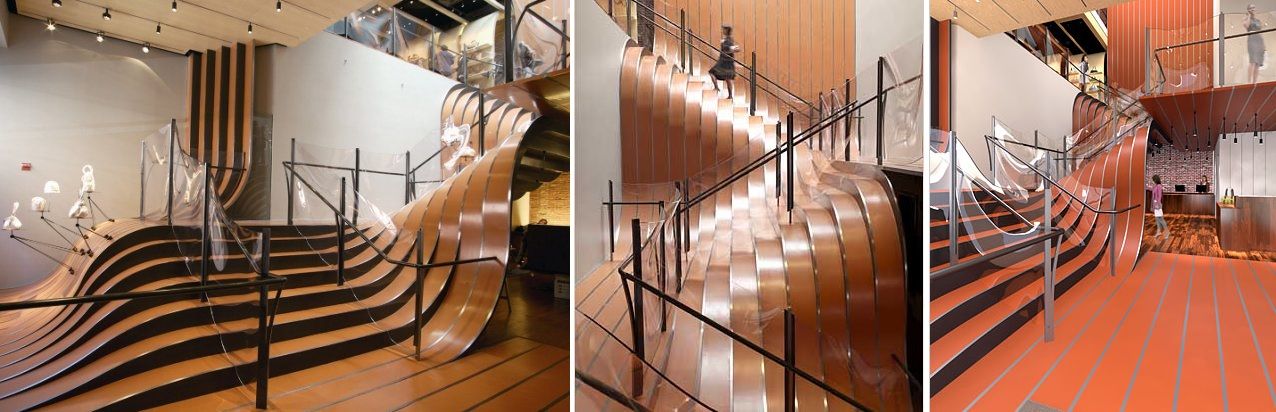 En tiendas u otros grandes espacios comerciales que ocupan más de un piso, la escalera es un elemento de diseño importante. Puede ser lo que diferencie el espacio de otros similares. Esta escalera es definitivamente memorable.
